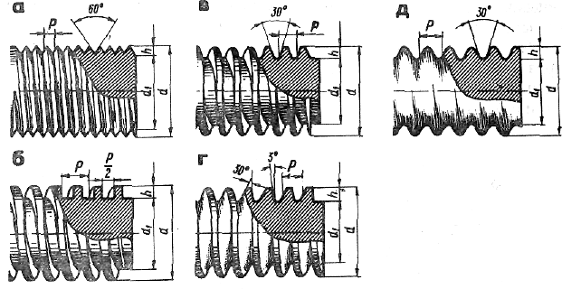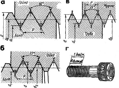 метрическая (а), дюймовая (б), трубная (в) и деталь с дюймовой резьбой (г)