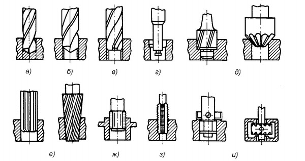 Работы, выполняемые на сверлильных станках: а — сверление отверстий; б — рассверливание; в — зенкерование; г — растачивание; д — зенкование; е — развертывание; ж — выглаживание; з — нарезание внутренней резьбы; и —цекование
