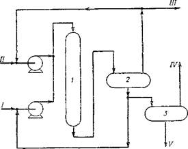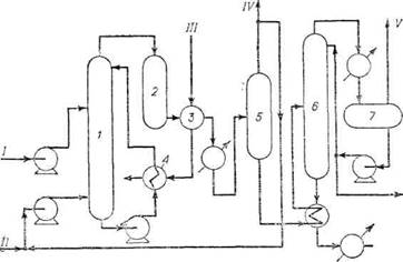 1 — основной реактор гидрирования; 2 — вспомогательный реактор гидрирования; 3 — теплообменник; 4 — конденсатор; 5 — сепаратор высокого давления; 6 — колонна стабилизации; 7 — сепаратор; / — бензол; // — водород; /// — вода; IV — отдувочный газ; V — циклогексан.