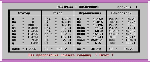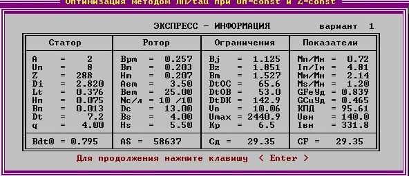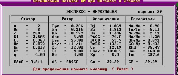 В последних двух таблицах представлены данные, рассчитанные компьютером, направленные на уменьшение приведенной стоимости и снижение расходов активных материалов. Также компьютер просчитал оптимальную комбинацию числа пазов статора Z и числаэффективных проводников в пазу Uп. Примем эти две величины как постоянные и попробуем улучшить характеристики нашего двигателя.