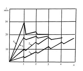 Рис. 1. Изменение температурного удлинения роторов l по мере съема припуска за n технологических переходов при различной производительности обработки (1 , 2 , 3 , 4 – номера обрабатываемых роторов)