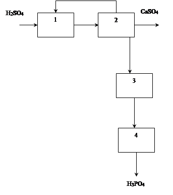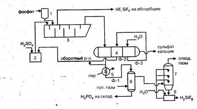 Смесь серной кислоты и оборотного раствора фосфорной кислоты из сборника 2 и фосфат из бункера 1 подают в многосекционный экстрактор 3. По мере движения пульпы в экстракторе образуется фосфорная кислота и завершается процесс кристаллизации сульфата кальция. Из последней секции экстрактора пульпа поступает на трехсекционный вакуум-фильтр 4. Основной фильтрат Ф-1 из первой секции фильтра отводится как продукционная фосфорная кислота, причем часть ее добавляется к оборотному раствору, направляемому в сборник кислоты 2. Осадок кальция на фильтре промывается противотоком горячей водой, при этом промывной раствор Ф-3 используется для первой промывке во второй секции фильтра. Фильтрат первой промывки Ф-2 направляется в виде оборотного раствора в сборник 2.