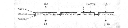 Электротермический метод производства фосфорной кислоты основан на восстановлении фосфатов до элементарного фосфора, его последующем окислении до оксида фосфора (V) и гидратации оксида до фосфорной кислоты: