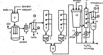 В трехфазную электропечь РКЗ-72 Ф (руднотермическая, круглая, закрытая, мощностью 72 MB. А, фосфорная) с самоспекающимися анодами 1 поступает из бункера 2 шихта, состоящая из фосфата, оксида кремния (кварцита) и кокса. Выходящий из печи газ, содержащий 6—10% фосфора, проходит через газоотсекатель 3 в электрофильтр 4, где из него извлекается пыль. Очищенный газ направляется в конденсаторы - промыватели - горячий 5 и холодный 6, охлаждаемые разбрызгиваемой в них водой, которая циркулирует по замкнутому контуру. Сконденсировавшийся жидкий фосфор собирается в сборниках 7 и 8, откуда поступает в отстойник 9.