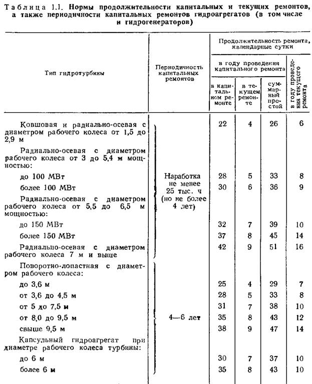 Нормы простоя и периодичность капитальных ремонтов гидроагрегатов, в том числе и гидрогенераторов, приведены в табл. 1.1, в которой приведена также продолжительность капитальных ремонтов гидроагрегатов в зависимости от диаметра рабочего колеса турбин и их типов, так как объем их типового ремонта преобладает.