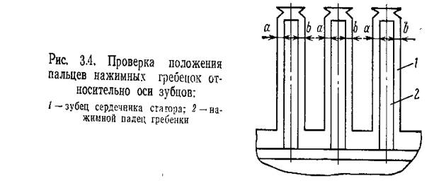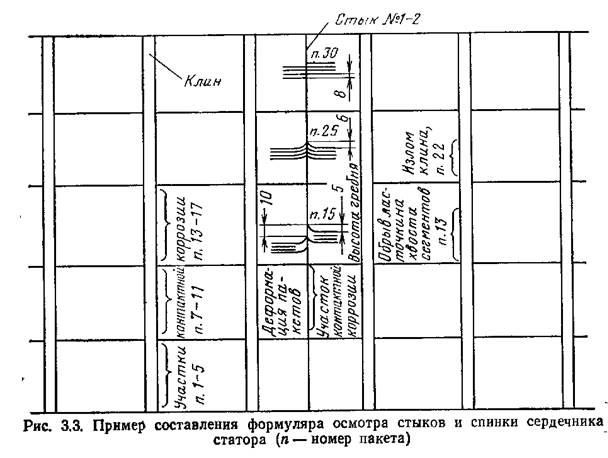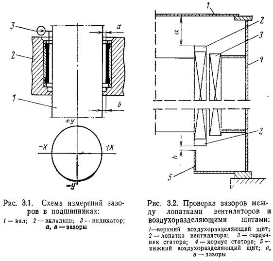 В процессе разборки (сборки) генератора производится измерение зазоров между базовыми и съемными (или вращающимися) деталями и их относительных положений. Зазоры измеряются пластинчатыми или клиновыми щупами, относительные положения масштабной линейкой, угольником, штангенциркулем, индикаторами. Линии валов проверяются индикаторами часового типа, за-крепленными на магнитных или иных подставках при поворотах ротора. Результаты измерений заносятся в формуляры. По результатам измерений оценивается состояние сборочных единиц и определяется необходимость выполнения тех или иных ремонтных операций.