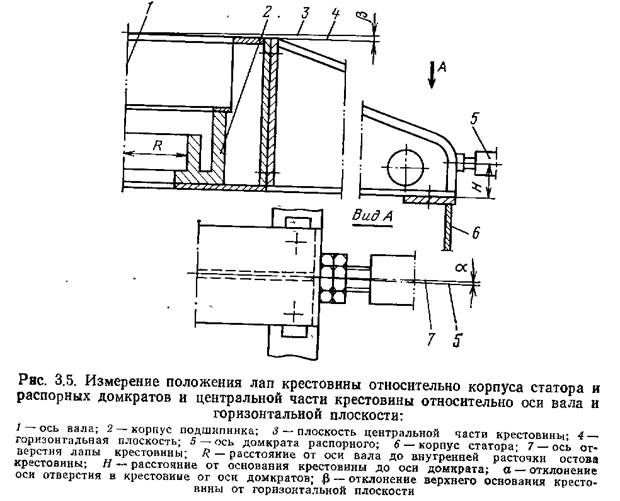 В объеме капитального ремонта генератора измерение зазоров производится для следующих сборочных единиц и деталей между полюсами роторов и сердечниками статоров главного генератора, вспомогательного генератора, углов измерительного генератора, между полюсами магнитной системы и якорями возбудителей и регуляторного генератора, в подшипниках (рис. З.1), между полюсами ротора и статором при проверке формы ротора и статора, в стыках секторов сердечника статора при замене прокладки, между фундаментными плитами и фланцем корпуса статора при исправлении положения статора. Проверка относительных положений и установочных размеров производится для следующих деталей и сборочных единиц: щеткодержателей относительно якоря возбудителя и контактных колец в осевом и радиальном направлениях, воздухоразделяющих щитов относительно лопаток вентиляторов (рис. 3.2), полюсов роторов относительно сердечников статоров главного и вспомогательного генераторов, полю-сов относительно якоря возбудителя, полюсов относительно обода ротора глав-ное о генератора, пакетов сердечника статора со стороны спинки для определения волны и деформации пакетов в стыках (рис. 3.3), относительное перемещение шеек и фланцев валов при центровке, нажимных пальцев гребенок относительно зубцов статора (рис. З.1), внутренней расточки остова крестовины относительно оси вала и основании относительно горизонтальной плоскости, крестовины относительно распорных домкратов (рис. 3.5).