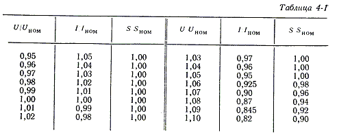 Гидрогенераторы обычно рассчитываются также из условия их длительной работы при повышении напряжения до 110% номинального включительно. Однако ввиду увеличения потерь в стали, вызываемых ими местных нагревов, а также роста тока и нагрева обмотки возбуждения сохранить при этом номинальную мощность не удается. Обычно при повышении напряжения свыше 105% номинального кажущаяся мощность гидрогенератора снижается примерно на 2% с каждым процентом повышения. Работа при напряжении более 110% номинального не допускается. Сказанное выше иллюстрируется в таблице 4-1.