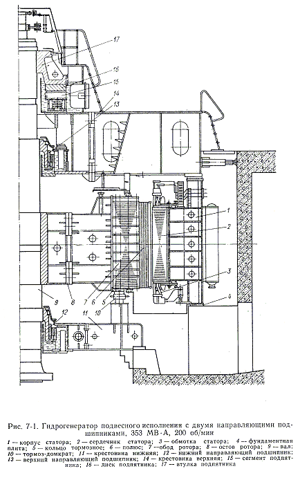 Подавляющее большинство гидрогенераторов выполняется с вертикальным валом, что обусловлено спецификой привода – гидравлической турбины, нерентабельностью, а во многих случаях и невозможностью создания гидрогенераторов больших размеров в горизонтальном исполнении по условиям обеспечения необходимых жесткостей статора и ротора, а также выполнения подшипников соответствующей грузоподъемности. Сборка, эксплуатация и ремонт крупных вертикальных машин осуществляются значительно легче, чем горизонтальных. Однако вертикальное положение валопровода приводит к появлению в конструкции гидрогенератора опорных элементов – подпятника и во многих случаях опорной крестовины, которые должны быть рассчитаны на восприятие усилий от массы вращающихся частей генератора и турбины, а также от реакций воды на ее рабочее колесо.