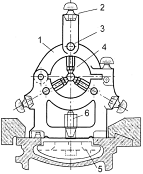 Неподвижный люнет (рис. 1) устанавливают на направляющих станины и крепят планкой 5 с помощью болта и гайки 6. Верхняя часть 1 неподвижного люнета откидная, что позволяет снимать и устанавливать заготовки на кулачки или ролики 4 люнета, которые служат опорой для обрабатываемой заготовки и поджимаются к детали винтами 2. После установки заготовки винты 2 фиксируют болтами 3. На заготовке, в местах установки роликов люнета, протачивают канавку. Проточку обычно выполняют посередине заготовки.
