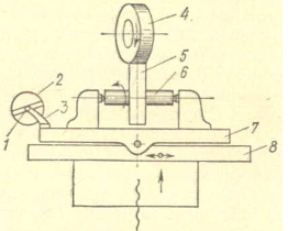 Скрещивание осей приводит к продольному относительному скольжению зубьев шевера и зубчатого колеса. Столу 8 сообщают продольную подачу 0,1...0,3 мм на один оборот зубчатого колеса. В конце хода стол подают в поперечном (вертикальном) направлении на 0,02...0,04 мм, после чего стол возвращают в начальное положение. Число ходов стола зависит от размера припуска. При необходимости получить зубья бочкообразной формы, имеющие большое распространение в современных конструкциях, используют предусмотренную в станке качающуюся плиту 7 с кронштейном 3 и установленным в нем пальцем 1. Палец индексируется в копире 2, укрепленном на кронштейне, и, скользя по копиру, заставляет плиту 7 в конце хода стола наклоняться, в результате чего шевер врезается в зубчатое колесо, формируя зубья у краев более тонкими, чем в середине.