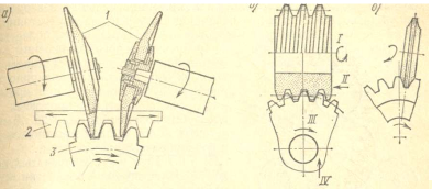 На рисунок 2, а изображена схема шлифования зуба цилиндрического колеса. Два шлифовальных круга 1 установлены таким образом, что их торцы, обращенные к шпинделям, совпадают с боковыми сторонами зубьев воображаемой производящей рейки 2, находящейся в зацеплении с заготовкой 3. Обкатываясь по вращающейся заготовке 3, шлифовальные круги своими торцами шлифуют поверхность зубьев колеса.