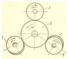 Обработка колёс методом притирки заключается в том, что обрабатываемое зубчатое колесо обкатывают между тремя притирами, оси которых скрещиваются между собой (рисунок 3). Оси двух притиров 1 и 4 со спиральными или прямыми зубьями наклонены к обрабатываемому зубчатому колесу 3. Ось третьего притира 2 параллельна оси обрабатываемого зубчатого колеса; этот притир вращается попеременно в разных направлениях со скоростью 30-60 м/мин для обеспечения равномерной обработки зуба с обеих сторон. Помимо вращения притирам сообщается возвратно-поступательное движение в осевом направлении со скоростью 60 - 70 ходов в минуту на длине 25 мм.