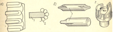 Чтобы устранить удары и выкрашивание кромок при переключении зубчатых колес, зубья закругляют специальными фрезами на зубоза-кругляющих станках. Профиль закругляемого зуба 1 на зубчатом колесе и траектория движения инструмента 2 при обработке показаны на рисунок 4, а. На рисунок 4, б приведены конструкции фрез для закругления зубьев колес: пальцевые фрезы 1 и коронная фреза 2.