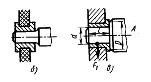 Болт – длинный цилиндр с головкой и наружной резьбой. Проходит сквозь соединяемые детали и затягивается гайкой (рис.1,а) – деталью с резьбовым отверстием. Винт – внешне не отличается от болта, но завинчивается в резьбу одной из соединяемых деталей (рис.1,б). Шпилька – винт без головки с резьбой на обоих концах (рис.1,в).