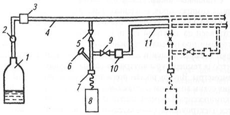 1 - баллон; 2 - фильтр-осушитель; 3 - редукционный клапан; 4 - заправочная магистраль;