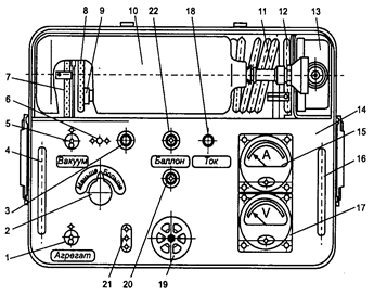 1, 5 — тумблеры; 2 — ручка автотрансформатора; 3 — предохранитель; 4,16— ручки; 6 — лампа; 7 — соединительный шнур; 8 — шнур; 9 — ключ герметичный; 10 — баллон со шлангом; 11 — шланг; 12, 20, 22— полумуфты; 13—мановакуумметр; 14—блок приборов; 15— амперметр; 17—вольтметр; 18—кнопка шунтирования амперметра; 19 — вентиль; 21 — розетка