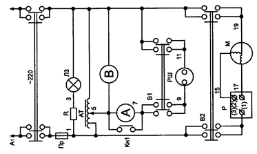 R — резистор 3,9 кОм; А — амперметр со шкалой на ЗА; AT— автотрансформатор типа ЛАТР-1М; В1, В2 — переключатели типа ТВ1-4; Кн1 — кнопка; ЛЗ — лампа типа КМ-48-50; М — компрессор типа ХКВ-6 с пусковым реле; Пр — предохранитель на 5 А; Р— реле пускозащитное типа LS-0.8B; РШ — розетка двухполюсная типа РД-1; В — вольтметр Э8003 со шкалой на 250 В.