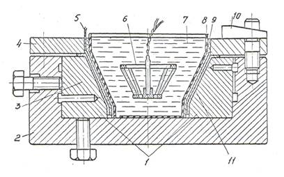Матрица, состоящая из 2-х половин 1, размещена в корпусе 2. заготовку прижимают в матрице с помощью кольца 4 и клинового устройства 10. воду 7 наливают в резиновый мешок 8, между стенками которого и пиротехническим составом 11 укладывают асбест 9. заряд 6, смонтированный из листового и шнурового ВВ, повторяет форму заготовки. Шнур 5 используют для воспламенения пиротехнического состава, с помощью которого нагревают заготовку. По этой схеме штампуют детали из молибденового сплава.