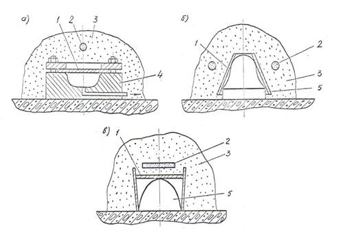 В матрицу 4 с уложенной на нее заготовкой 1 засыпают песок 3, в котором осуществляют взрыв заряда ВВ 2 (рис. 3-а). Согласно другим схемам требуемую форму деталей получают штамповкой по пуансону 5, причем заготовка может быть как плоской (рис. 3-б), так и предварительно сваренной в виде конструкции сложной формы (рис. 3-в).