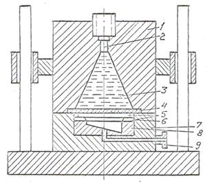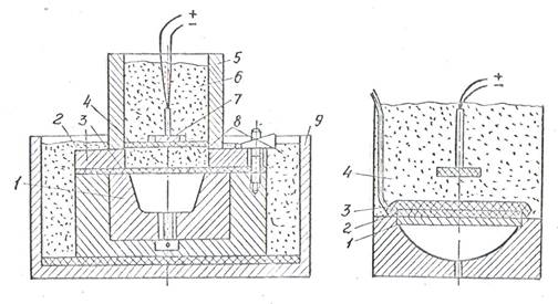 На рисунке 4-а [44] показана схема установки для штамповки вольфрамовой заготовки 3, нагретой горячим песком 8, одновременно служащим и передающей средой. Песок предварительно нагревают в печи, а затем насыпают на заготовку, закрепленную в штампе 1-2. штамп также предварительно нагревают в печи или горелками. Для того чтобы штамп быстро не остывал, его помещают в контейнер 9 с горячим песком. На горячий песок, расположенный над заготовкой, укладывают асбестовый круг 4, на который затем устанавливают заряд ВВ 7, снабженный электродетонатором, после чего в емкость засыпают холодный песок 6.