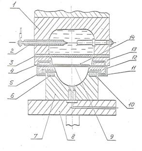 С целью дальнейшей интенсификации процесса электрогидравлической штамповки [54] проведены работы по штамповке с нагревом. На рисунке 9 представлена схема технологического блока пресса ПЭГ – 60 модернизированного для штамповки с нагревом [Р5]. разрядная камера 1 с установленным электродом 2 отделена от заготовки 9 резиновой диафрагмой 3, прижимным кольцом 13 с вмонтированным в него теплоизоляционным слоем 4 и теплоизоляционной прокладкой 14. Матрица 7, установленная на столе пресса 8, имеет съемное кольцо 12, в котором смонтирована спираль для нагрева 10, изолируемая от корпуса матрицы кольцом 6.