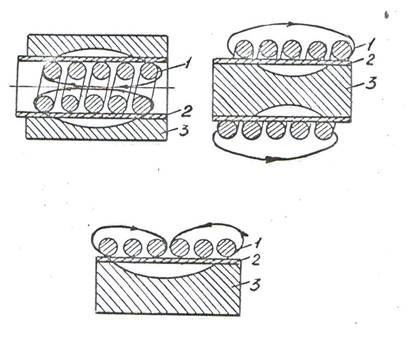 Электросхема установок для электромагнитной штамповки аналогична электросхеме установок для электрогидравлической штамповки, однако, принцип преобразования электрической энергии, накопленной в конденсаторах, в необходимую для штамповки механическую энергию отличается. Электромагнитная штамповка основана на преобразовании электрической энергии в механическую за счет импульсного разряда конденсаторов через соленоид, вокруг которого при этом возникает магнитное поле высокой мощности, наводящее вихревые токи в трубчатой или листовой токопроводящее заготовке. взаимодействие вихревых токов с магнитным полем создает механические силы, которые производят деформирование заготовки по пуансону или матрице. На рис. 10 – 13 приведены схемы формоизменения с помощью импульсных магнитных полей [43, 56÷65, 185÷191].