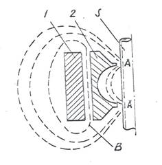 Рис. 11. Концентрация магнитного потока в двух зонах АА круглой заготовки: