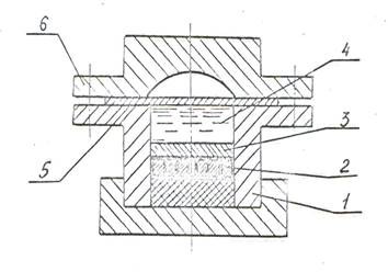 Рис. 13. Принципиальная схема магнитно-импульсной штамповки через промежуточную среду (воду): 1 – корпус; 2 – индуктор; 3 – поршень; 4 – вода; 5 – заготовка; 6 – матрица.