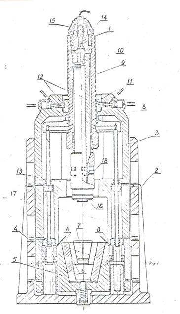 В верхней части силовой рамы 3 резьбовой гайкой 11 и гидромеханическим замком 12 фиксируется направляющий ствол с полым рабочим штоком 9 и снаряд-бойком 10. Он может перемещаться гидроцилиндрами 13 и включает взрывную камеру 14 с зазором 15, предназначенными для установки и подрыва заряда пороха 1.