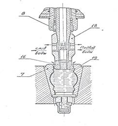 Внутренняя полость заготовки заполняется водой до сливных отверстий в буксе 18, одновременно во взрывную камеру 14 устанавливают заряд пороха 1 и запирают затвор 15. После этого производится подрыв заряда пороха и под действием давления пороховых газов снаряд-боек 10 разгоняется по стволу до требуемой скорости и в конце хода ударяет по зеркалу воды, создавая в ней высокое давление, которое, воздействуя на заготовку, деформирует ее по внутренней полости матрицы, образуя, таким образом, нужную деталь.