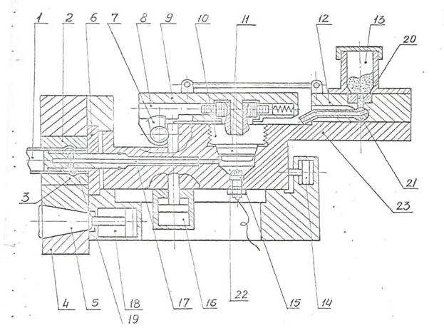 Порох из бункера 13, установленного на корпусе 23, заполняет полость мерной шайбы 20 и при открывании затвора 10 с помощью цилиндра поворота и открывания затвора 16 путем вращения зубчатого сектора 7, перемещения до упора рейки 8, поворачивающей сам затвор 10, а при дальнейшем движении штока цилиндра 16 и поворота рычага затвора 9 производится передвижение ползуна до затвора дозы пороха из мерной шайбы 20 через питатель21 в камеру сгорания 22. затем затвор 10 запирает через уплотнительное кольцо 11 камеру сгорания 22, производится поджиг пороха зональной свечой 15 и выделяющиеся при сгорании пороха газы по каналу оправки 17 через эластичное уплотнение 19 деформирующий заготовку 1.