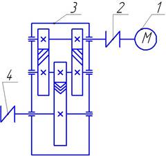 Вращение привода передается от вала электродвигателя 1 к выходной муфте 4 через входную муфту 2 и двухступенчатый редуктор 3.