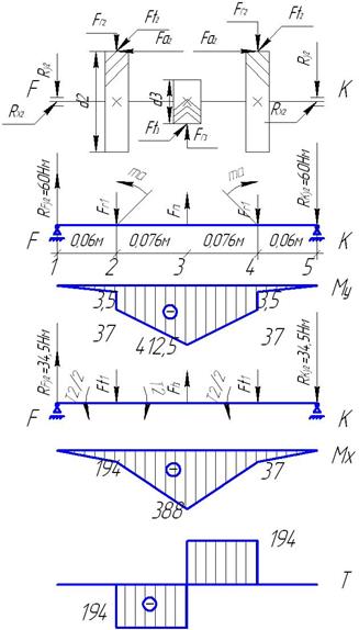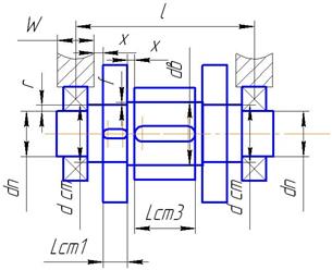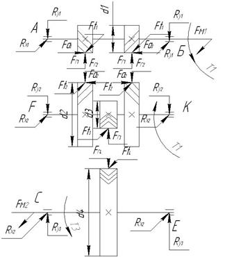 Т1 =250Нм; Т2 =2000Нм; D1 =100мм; D2 =200мм; d1 =14мм; d2 =24мм; l1 =121мм; l2 =218мм; z1 =6; z2 =8.