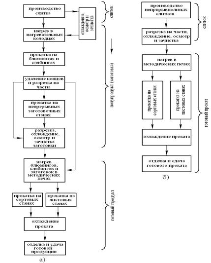 Схема технологического процесса производства проката: а) – из обычного слитка; б) – из заготовки, полученной непрерывной разливкой.
