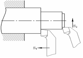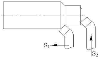 Проходным отогнутым резцом можно выполнять подрезку торца при поперечной подачи s1 и обтачивание при продольной подаче s2 резца.
