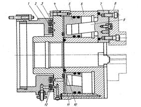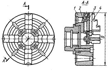 Патрон с встроенным приводом имеет встроенный пневмоцилиндр 6 с поршнем 5 и крепится к станку фланцем 1. Резиновое кольцо 11 смягчает удары поршня о фланец 4. Уплотнительные кольца 10 и 12 обеспечивают герметичность пневмопривода. Ползуны 7 (с зажимными кулачками 8) имеют выступы 9, которые входят в пазы поршня 5. Угол наклона пазов 40°30’, что обеспечивает условия самоторможения. При подаче воздуха по каналам 2 и З в левую или правую полость цилиндра ползуны 7 перемещаются от центра патрона или к его центру и через кулачки 8 разжимают или зажимают заготовку. Четырехкулачковый патрон с независимым перемещением кулачков состоит из корпуса 1, в котором выполнены четыре паза, в каждом пазу смонтирован кулачок 4 с винтом 3, используемым для независимого перемещения кулачков по пазам в радиальном направлении. От осевого смещения винт З удерживается сухарем 2.
