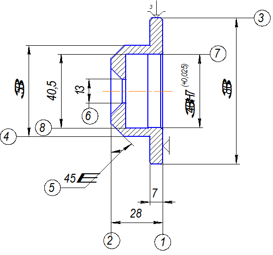 | О | 11 | 10. Расточить конус под углом 45° относительно поверхности 6 | ||||||||||||||||||||||||||||||||||
