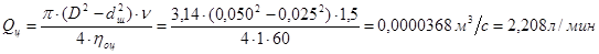 где ηоц -объемный к.п.д. гидроцилиндра, при уплотнении поршня резиновыми кольцами и манжетами ηоц =1.0;