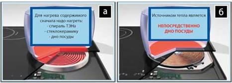 - с ИК-генераторам и (галогеновые нагреватели) с нижней стороны стеклокерамической конфорки;