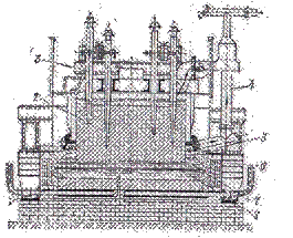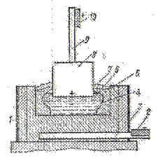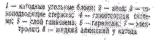 Электролизер состоит из основного корпуса 1, футерованного внутри угольными блоками; в его подовую часть с помощью шин 2 и 3 подведен отрицательный полюс источника тока. Над корпусом подвешен угольный анод 8, к которому с помощью шин 9 и 10 присоединен положительный полюс источника напряжения. Если в электролизер залить расплав, состоящий из криолита и глинозема, опустить в этот расплав анод и пропускать через расплав постоянный ток большой силы и необходимого напряжения, то через определенное время на дне электролизера можно обнаружить расплавленный алюминий 4 под слоем расплавленного электролита 6, состоящего из криолита Na3 AlF6 , в котором при температуре, близкой к 1000 С, обычно растворено от 1 до 10% глинозема. Электролит поддерживается в расплавленном состоянии только за счет теплоты, выделяющейся при прохождении через него электрического тока, поэтому часть электролита всегда застывает на холодных стенках и образует твердую застывшую корку 5, на которую сверху насыпают порошкообразную окись алюминия 7.