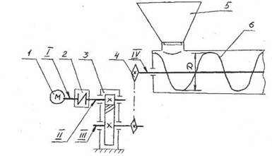 1−электродвигатель; 2− муфта; 3−редуктор цилиндрический косозубый; 4−цепная передача; 5−загрузочный бункер; 6−шнек; I- вал двигателя; II- ведущий вал редуктора; III- ведомый вал редуктора; IV− вал рабочей машины.