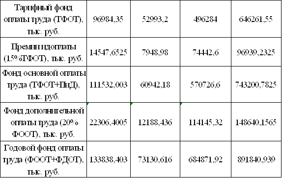 Расчет годового фонда зарплаты производится по категориям работающих на основании ранее выполненных расчетов тарифного фонда зарплаты рабочих и годового фонда зарплаты приведен в табл. 2.13.