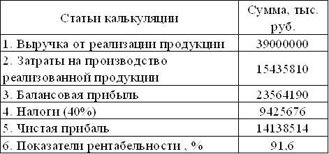 При объеме выпуска продукции 1000 штук в год, объем продаж составил 39000000 рублей, себестоимость всего объема производства 15435810 рублей, себестоимость единицы продукции соответственно 29146 рублей. Балансовая прибыль составила 23564190 рублей. Рентабельность производства составила 91,6 %, это показывает, что на каждый вложенный рубль приходится 91,6 копейки прибыли. Срок окупаемости данного проекта составил 2 месяца.