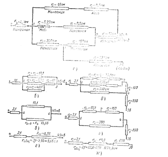 а – общая схема для пределов 45 мв и 3 в; б, в, г – преобразование сложной схемы в простую (предел 45 мв); д, е, ж – преобразование сложной схемы в простую (предел 3 в)