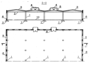 1 — колонны; 2 — балки покрытия; 3 — ограждение покрытия; 4 — фонари; 5 — переплеты фонарей; 6 — наружная самонесущая стена; 7 — фундаменты колон; 8 — ворота; 9 — окна; 10 — пол на грунте.