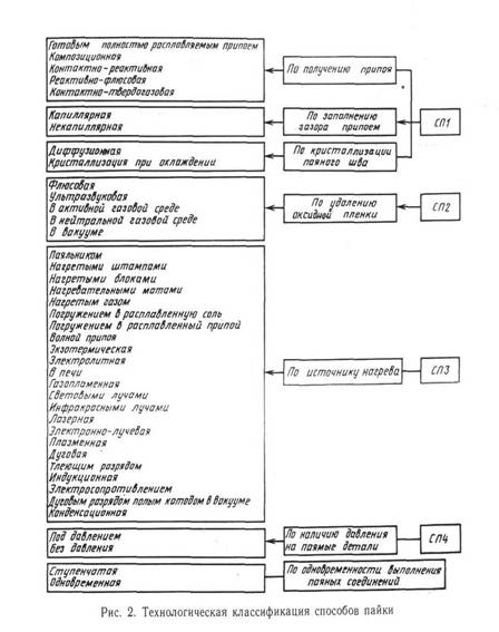 Технологическая классификация способов пайки базируется в основном на альтернативности их признаков. На рис. 2 дана технологическая классификация способов пайки (ГОСТ 17349—79). В наименование способа пайки конкретного изделия должны войти по одному или несколько наименований способов из каждой группы и в том же порядке, в каком они перечислены на рис. 2. Например, «контактно-реактивная капиллярная диффузионная печная пайка в вакууме под давлением».