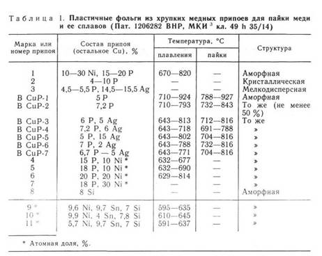 В табл. 1 приведены данные о пластичных фольгах припоев на основе меди и никеля.