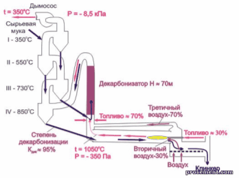 После прохождения циклонных теплообменников сырьевая мука с температурой 720...750 °С поступает в декарбонизатор. Частицы сырьевой муки и распыленное топливо диспергируются и перемешиваются. Теплота, выделяющаяся в результате сгорания топлива, немедленно передается частицам сырьевой муки, которые нагреваются до температуры 920...970°С. Материал в системе "циклонный теплообменник - декарбонизатор" находится лишь 70...75 с и за это время декарбонизируется на 85...95%. Установка декарбонизатора позволяет повысить съем клинкера с 1 м3 внутреннего объема печи в 2,5...3 раза. Удельный расход теплоты снижается до 3,0...3,1 МДж/кг клинкера. Кроме того, в декарбонизаторе можно сжигать низкокачественное топливо, а также бытовые отходы. Стоимость сооружения установки с декарбонизатором на 10% ниже стоимости установки с циклонным теплообменником той же производительности. Размеры установки невелики, и она может использоваться не только при строительстве новых заводов, но и при модернизации действующих печей.