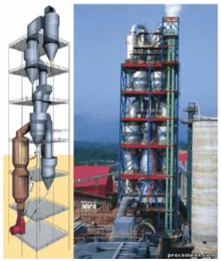 Циклонными теплообменниками оборудуются короткие вращающиеся печи (50-70 м). Теплообменники, установленные над загрузочными концами печей, располагаются один над другим и предназначены подобно конвейерным кальцинаторам для подогрева и частичной декарбонизации сырьевой смеси. Но в отличие от конвейерных кальцинаторов материал, подлежащий обжигу в теплообменники, поступает не в виде гранул, а в виде порошкообразной смеси.